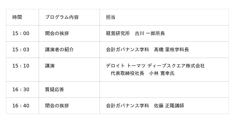 当日は講師として、デロイト トーマツ ディープスクエア株式会社 代表取締役社長 小林 寛幸氏をお迎えします。小林氏には起業の経験に加え、経営していくうえで必要となるAIとの関わりについても語っていただきます。また、AIビジネスの成功事例をふまえ、小林氏の考える「起業を成功させる秘訣」についてご紹介します。