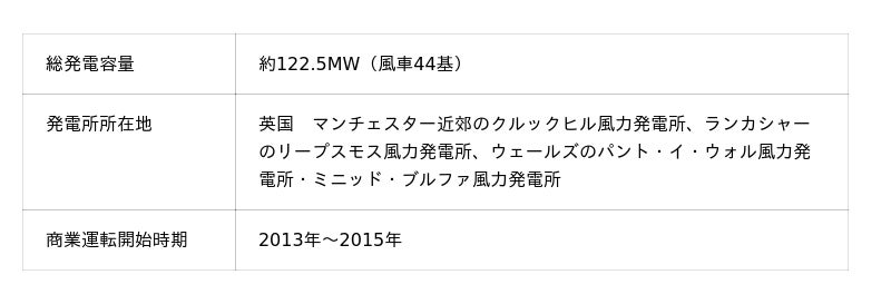 本事業は、英国のイングランドおよびウェールズに所在する稼働済みの計4ヶ所の風力発電所で構成されています。計44基の風車による総発電容量は約122.5MWと、英国の一般家庭67,000世帯以上の年間電力消費量に相当する発電能力を有しています。各発電所は、2013年~2015年に商業運転を開始しており、長期の電力購入契約ならびにRenewable Obligation Certificates(ROC:再生可能エネルギー義務証書)制度※1に基づく売電により、長期にわたる安定した収益が見込まれています。