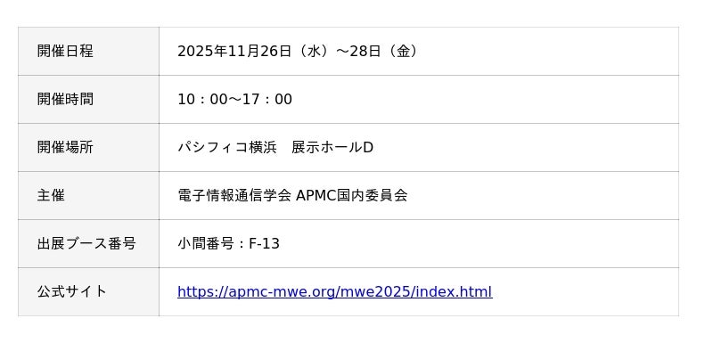 エレクトロニクス商社の丸文株式会社(代表取締役社長 兼 CEO / COO︓堀越裕史、本社︓東京都中央区、以下、丸文)は、11月26日(水)~28日(金)にパシフィコ横浜で開催される「マイクロウェーブ展2025」に出展します。