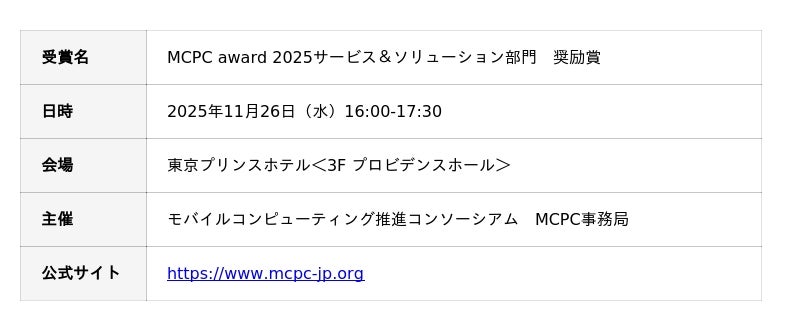 MCPC awardは、モバイルコンピューティングの普及促進と技術発展に貢献する優秀なサービス・ソリューションを表彰する権威ある賞として、業界内外から高い評価を受けています。この度の受賞は、運送業界のデジタルトランスフォーメーション(DX)推進における「運SOUL」の革新性と社会的意義が認められた証であり、開発チーム一同、大変光栄に存じます。
