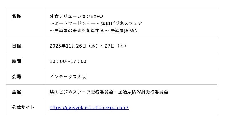 株式会社ClassLab.(代表取締役社長:古屋敷 大樹、本社:大阪府中央区、以下、ClassLab.)は、2025年11月26日(水)・27日(木)にインテックス大阪で開催される「外食ソリューションEXPO」に出展いたします。