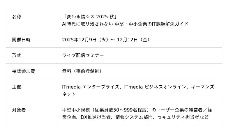 本イベントでは、中堅・中小企業がAIを定着させるための現実的な手法、セキュリティ強化をはじめとする環境整備、さらには足元の業務改善やIT資産管理まで、先進企業の事例や専門家の実践的なアドバイスをお届けします。