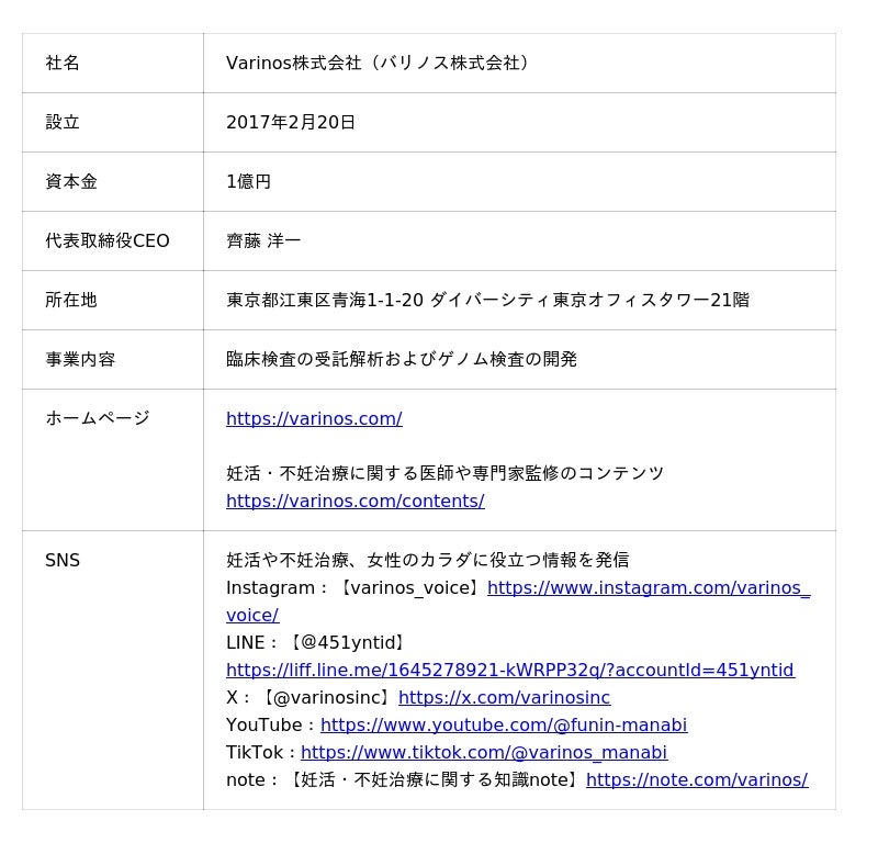 Varinos株式会社“ゲノム解析技術を通じて、家族の未来をつくる”をミッションに、臨床検査サービスの開発と提供を行う。不妊治療領域においては、妊娠率や出産率に影響すると言われている子宮内フローラに着目し、菌の種類と割合を調べる「子宮内フローラ検査」を2017年に世界で初めて独自開発・臨床検査として実用化(2022年6月、先進医療に認定)。