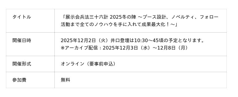 【展示会装飾ラボ登壇】Bizibl社主催ウェビナー開催 「展示会兵法三十六計 2025冬の陣 ~ブース設計、ノベルティ、フォロー活動まで全てのノウハウを手に入れて成果最大化!~」