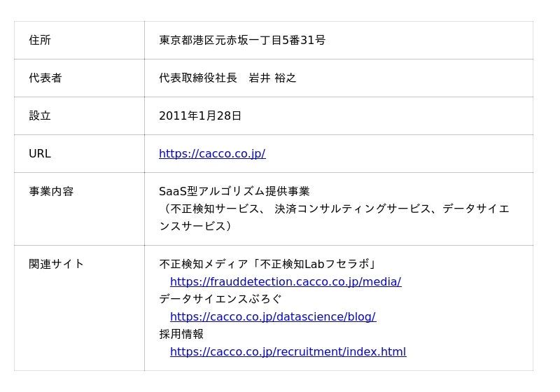 Caccoは、「未来のゲームチェンジャーの『まずやってみよう』をカタチに」という経営ビジョンを掲げ、セキュリティ・ペイメント・データサイエンス技術をもとに、アルゴリズム及びソフトウエアを開発・提供し企業の課題解決やチャレンジを支援することを目指しております。 オンライン取引における「不正検知サービス」を中核サービスとして位置づけ、不正会員登録/不正ログインから不正注文対策まで対応可能な国内での導入実績数No.1の不正検知サービス「O-PLUX」や金融機関や会員サイトにおける情報漏洩対策の不正ログイン検知サービス「O-MOTION」、フィッシング対策サービス等を提供しております。