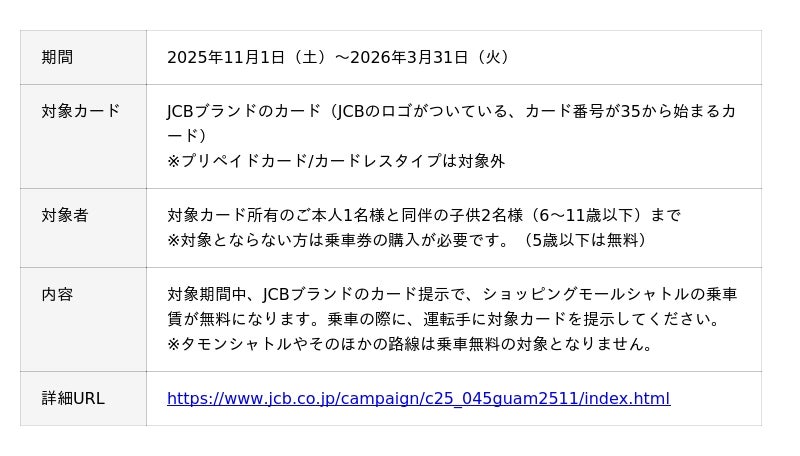 日本発唯一の国際カードブランド運営会社である株式会社ジェーシービー (本社:東京都港区、代表取締役会長 兼 執行役員社長:二重 孝好)の海外業務を行う子会社、株式会社ジェーシービー・インターナショナル(本社:東京都港区、代表取締役社長:陽川 勝樹)(以下、総称してJCB)とJTBグループのT.P. Micronesia, Inc.(本社:アメリカ合衆国グアム準州、取締役社長:高橋 潤一朗)(以下、TPM)は、2025年11月1日(土)から2026年3月31日(火)まで、グアムのショッピングモールシャトル乗車賃無料キャンペーンを実施いたします。今回のキャンペーンは、2025年初頭に実施し大変ご好評をいただいた第1弾に続いて開催します。期間中、対象のJCBカードをご提示いただくと、カード会員様1名分と、さらに今回からは同伴のお子様2名までの乗車賃が無料となります。