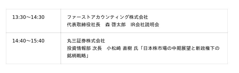 経理シンギュラリティを実現するファーストアカウンティング株式会社(本社:東京都港区、代表取締役社長:森 啓太郎、以下、ファーストアカウンティング)は、2025年11月17日(月)に上越市市民プラザで開催される「丸三証券 株式セミナー」へ登壇いたします。