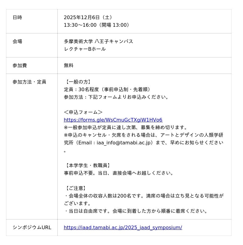 また、アートとデザインの人類学研究所所員である港千尋(情報デザイン学科教授)、椹木野衣(リベラルアーツセンター教授)、佐藤直樹(グラフィックデザイン学科教授)、金沢百枝(芸術学科教授)、および陳芃宇(日本画専攻講師)が登壇し、議論を深めます。