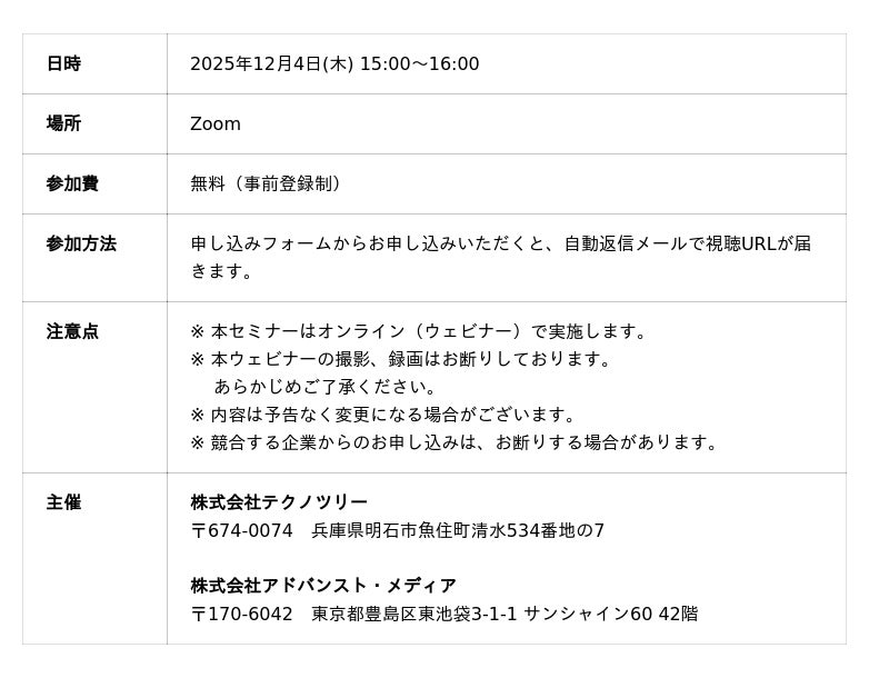 2025年12月4日(木)、株式会社アドバンスト・メディア(本社:東京都豊島区、代表取締役会長兼社長:鈴木清幸 以下、アドバンスト・メディア)は、オンラインセミナー「“声で入力する現場”へ。XC-Gate × 音声認識で入力作業を効率化&ミス削減!」を共催いたします。