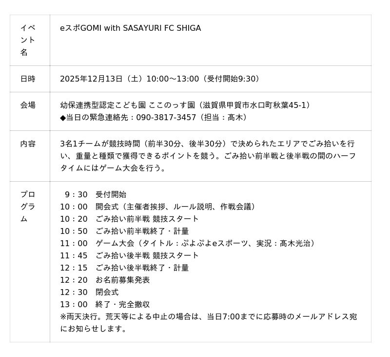 本イベントは、滋賀県甲賀市を拠点とするSASAYURI FC SHIGAが、地域への貢献を目指し企画された環境保全活動です。環境保全活動の広がりと継続性を確保するため、eスポGOMI開催委員会が提供する環境保全イベント「eスポGOMI」の“楽しさ”と、SASAYURI FC SHIGAが長年にわたり培ったスポーツ振興の経験が融合します。