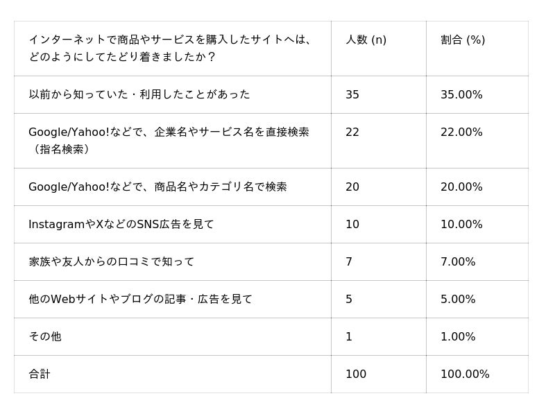 最も大きな傾向として、「以前から知っていた・利用したことがあった」(35.00%)と「企業名やサービス名を直接検索した(指名検索)」(22.00%)を合わせると、回答者の57.00%が既にその企業やブランドを認知している状態からアクセスしていることが分かりました。