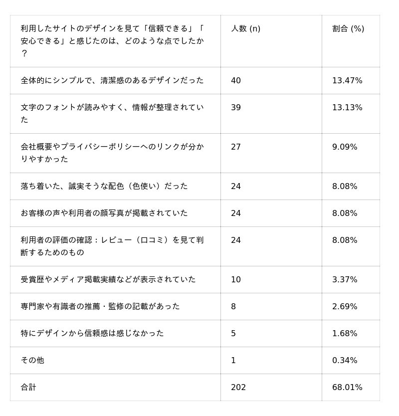 【 質問2. 】利用したサイトのデザインを見て「信頼できる」「安心できる」と感じたのは、どのような点でしたか?当てはまるものを全て選んでください。