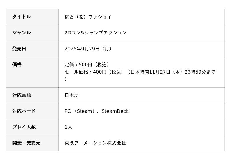 東映アニメーション株式会社(本社:東京都中野区、代表取締役社長:高木勝裕)は、Steamプラットフォームにて配信中の、アニメ「ガールズバンドクライ」から生まれた謎ゲーム『桃香(を)ワッショイ』を11月14日(金)より、2週間限定で20%OFFのセールを実施することをお知らせいたします。
