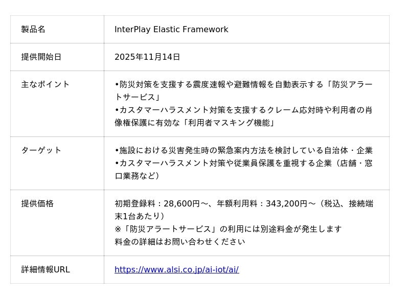 アルプス システム インテグレーション株式会社(本社:東京都大田区、代表取締役社長:金子 央、以下ALSI〔アルシー〕)は、無人・遠隔・自動案内など状況に合わせて利用できるリモート接客・受付システム「InterPlay Elastic Framework(インタープレイ エラスティック フレームワーク)」をアップデートし、防災対策を支援する「防災アラートサービス」と、カスタマーハラスメント対策を支援する「利用者マスキング機能」を追加し、2025年11月14日より提供開始いたします。