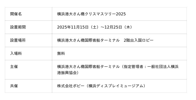 2025年冬、横浜港大さん橋国際客船ターミナル(指定管理者:一般社団法人横浜港振興協会)では、柱のない開放的な出入国ロビーに高さ5メートルのクリスマスツリーを設置いたします。本企画は、国内最大級の造花・ディスプレイ用品専門店「株式会社ポピー(横浜ディスプレイミュージアム)」との共催により実施します。