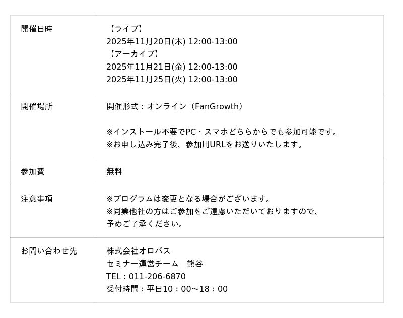SEOツール「パスカル」の開発・提供を行う株式会社オロパスは、2025年11月20日(木)に「最新トレンド|AI検索の先に待つ“SEO回帰” 今、何をして、何をすべきではないか」をテーマに掲げた共催ウェビナーに登壇いたします。