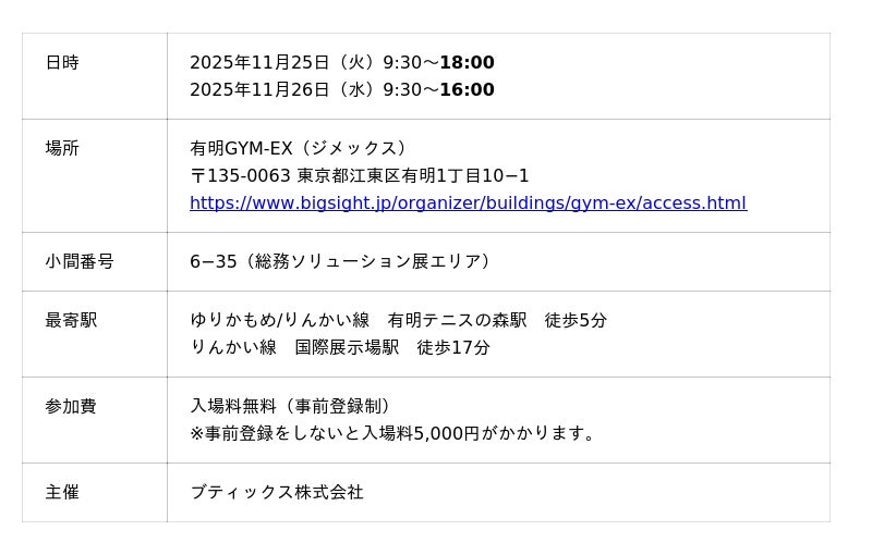 株式会社キャリオット(本社:東京都港区、代表取締役社長 齋藤 洋徳)は、2025年11月25日(火)と26日(水)、有明GYM-EX(ジメックス)で開催される「バックオフィスDXPO 東京」に出展します。