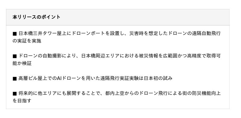 両社は、本実証を通したドローンの有効性検証を元に、安心・安全な街づくりを推進し、社会全体のレジリエンス向上に貢献してまいります。