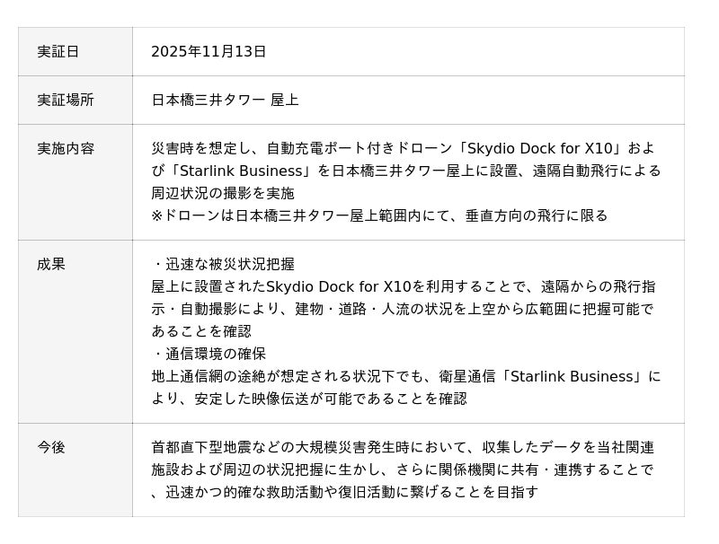 日本橋三井タワー屋上に、自動充電ポート付きドローン「Skydio Dock for X10」、「Starlink Business」を設置し、2025年11月13日に実施された避難訓練に合わせ、災害時を想定した遠隔自動飛行の実証実験を行いました。