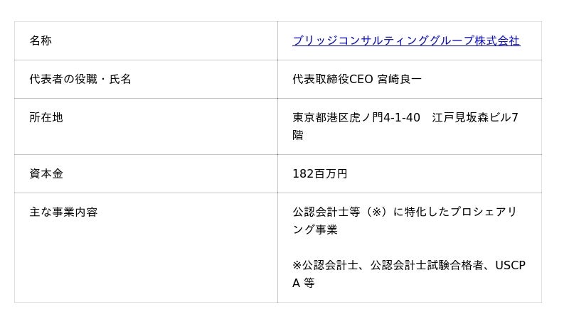 ブリッジコンサルティンググループ株式会社(本社:東京都港区、代表取締役CEO:宮崎良一、東証グロース:証券コード9225、以下「当社」)は、2025年11月14日、会計業界における拠点数で国内最大規模を有する辻・本郷税理士法人(本社:東京都新宿区)を中心とする辻・本郷グループ(グループ会長:本郷孔洋氏)が立ち上げたファンドへの第三者割当増資を実施することをお知らせします。
