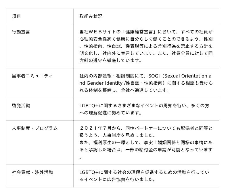 Policy(行動宣言)、Representation(当事者コミュニティ)、Inspiration(啓発活動)、Development(人事制度・プログラム)、Engagement/Empowerment(社会貢献・渉外活動)の5つの指標それぞれで評価を行うもので、当社は5項目すべてを満たし、「ゴールド」を4年連続で受賞しました。