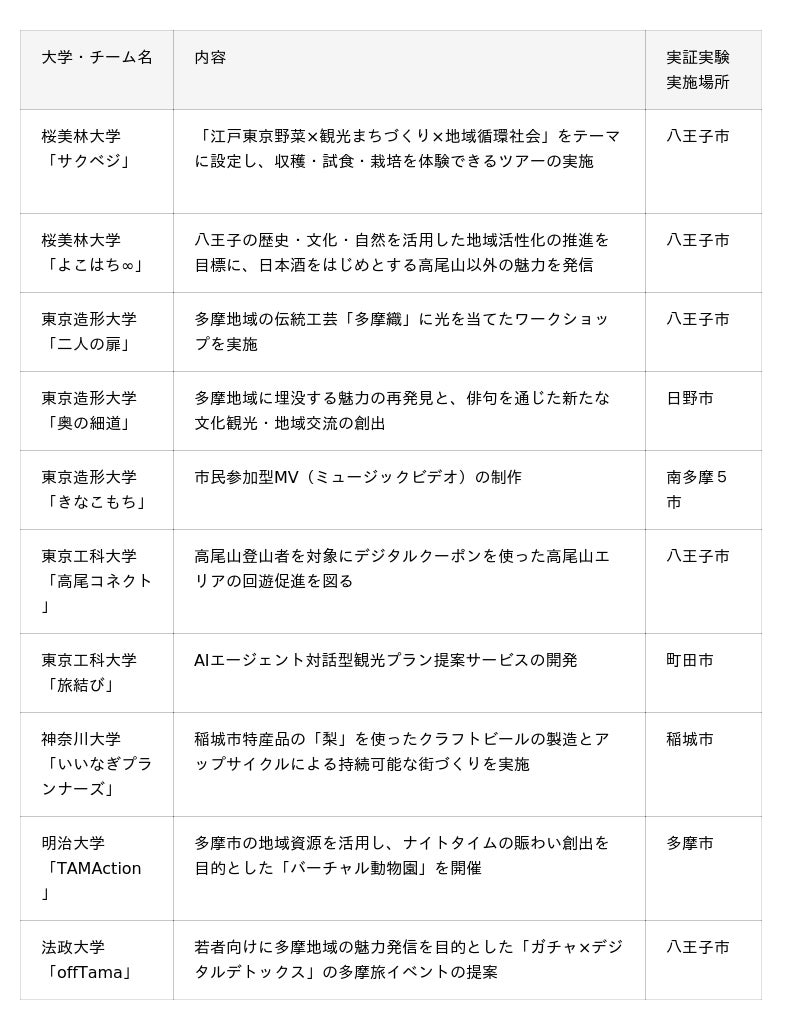次世代を担う大学生等により構成されるチームを対象に、南多摩5市(多摩市、稲城市、八王子市、日野市、町田市)のプロモーションに繋がるアイデア企画を公募し、自治体・観光協会・地元事業者と連携した事業構築により、次年度以降の社会実装を目指すプロジェクトです。