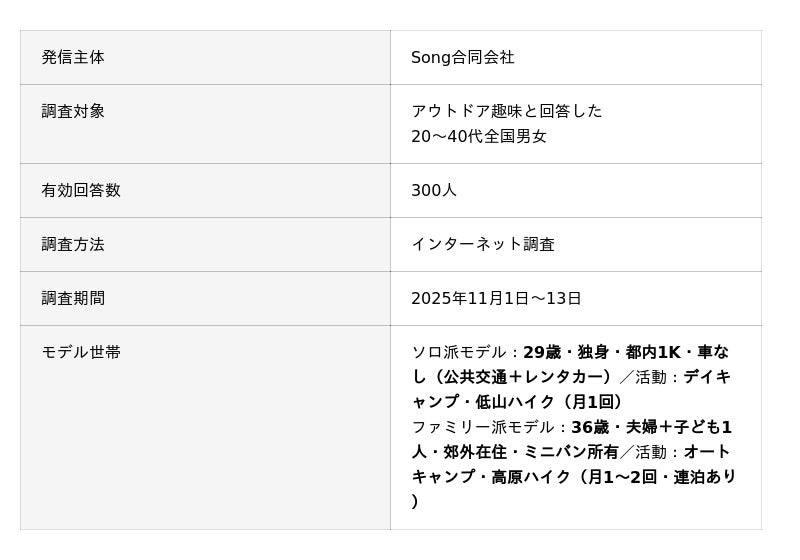自然と触れ合い、心身を整える--そんな理想とは裏腹に、アウトドア趣味には思わぬ出費が積み重なる現実があります。 本調査では、20~40代の男女300名を対象に、キャンプ・登山・ハイキング・車中泊などのアウトドア活動における初期費用、維持費、そして“コスパ改善”の工夫までを徹底調査。 ソロ派・ファミリー派それぞれのモデルケースを設定し、実際にどれほどの金額がかかっているのか、そのリアルを可視化しました。