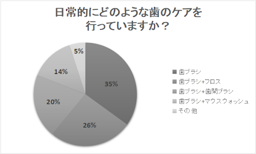 次に多かったのは、「歯ブラシ+フロス」で26%です。そして、「歯ブラシ+歯間ブラシ」が20%、「歯ブラシ+マウスウォッシュ」で14%でした。全体的にみると歯ブラシだけのケアではなく、歯ブラシと他のケアを組み合わせている人が多いことがわかりました。