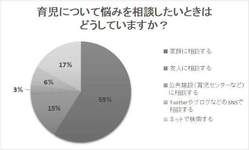 やはり、育児の悩みは家族の中で共有しておきたいと思っている人が多いようです。また、次に多かったのが、「ネットで検索する」で17%でした。