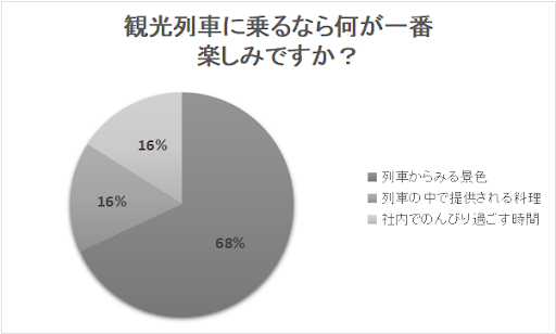 最後に、「観光列車に乗るなら何が一番楽しみですか?」というアンケートも行いました。すると、一番多かった回答は「列車からみる景色」で68%でした。