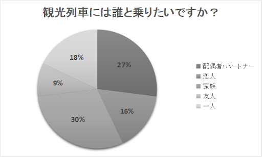 また、意外に数字を伸ばしているのが「一人」で18%です。ゆったりできる観光列車だからこそ一人旅としても人気があるのかもしれません。