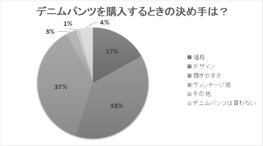 次に、「デニムパンツを購入するときの決め手は?」というアンケートも行いました。すると、一番多い回答は「デザイン」で38%でした。