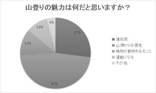 ズの通り、「達成感」と答えた人は27%、「山頂からの景色」が47%、「植物や動物をみること」が12%と80%以上の人が、登った人にしか体験できないことが魅力だと感じる人が多いようです。
