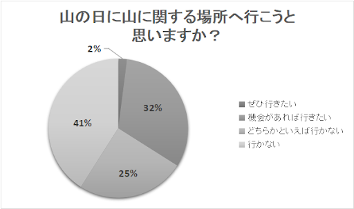 次に、「山の日に山に関する場所へ行こうと思いますか?」というアンケートも行ってみました。結果は、「ぜひ行きたい」が32%、「機会があれば行きたい」が25%、「どちらかといえば行かない」が41%、「行かない」が2%という結果です。
