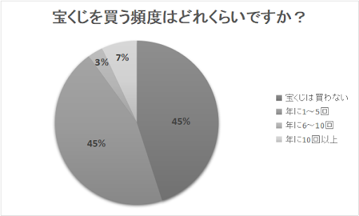 また、「年に6~10回」と答えた人は3%、「年に10回以上」と答えた人が7%という結果です。この結果からみると宝くじを購入する人と購入しない人は約半々といったことがわかります。