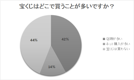 「宝くじは買わない」と答えた人は44%いましたが、多くの人は「店頭が多い」と答え、42%でした。そして、「ネット購入が多い」と答えた人は14%と少数意見でした。