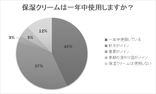 保湿クリームを使用している人は、一年中使用する人が多い中で、乾燥しがちな秋冬がメインで使用している人も多いことがわかりました。