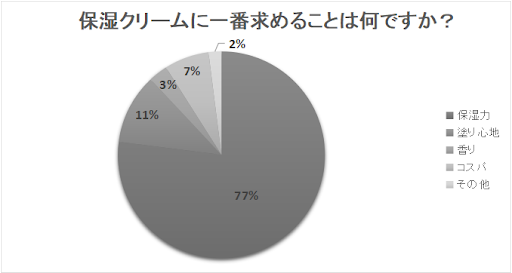 続いて、「保湿クリームに一番求めることは何ですか?」というアンケートも行いました。すると、もちろん「保湿力」と答えた人が多く77%という結果でした。
