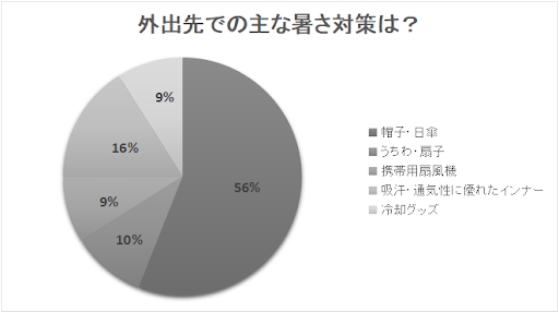 次に、外出先での暑さ対策をアンケートで聞いてみました。一番多かった答えは、「「帽子・日傘」で56%でした。
