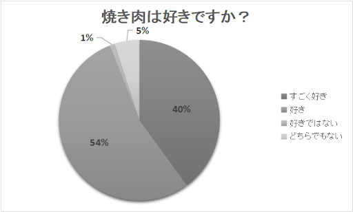 綺和美では、「焼き肉は好きですか?」というアンケートを行いました。すると、40%の人が「すごく好き」と答え、54%の人が「好き」と答えたのです。