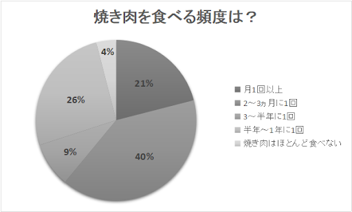 続いて、90%以上の人が「焼き肉好き」とわかったので、「焼き肉を食べる頻度」についてもアンケートを行ってみました。すると、一番多かったのは、「2~3ヶ月に1回」で40%でした。