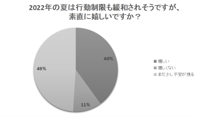 結果は、「嬉しい」と答えた人が40%、「まだ少し不安が残る」と答えた人が49%でした。コロナウィルスに感染すると、病院または自宅などで療養しなくてはいけないため、できるだけ感染したくない人が多いのが事実です。
