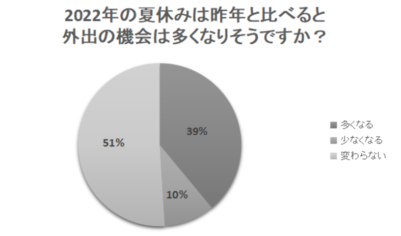しかし、2022年は行動制限が緩和されて約3年ぶりに旅行や帰省がしやすくなると思います。そこで、「2022年の夏休みは昨年と比べると外出の機会は多くなりそうですか?」というアンケートを行ってみました。