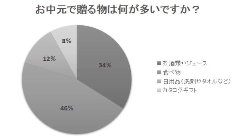 一番多かった回答は、「食べ物」で46%でした。食べ物と言っても幅広く、ハムや果物、スイーツ、そうめんなどが多いようです。