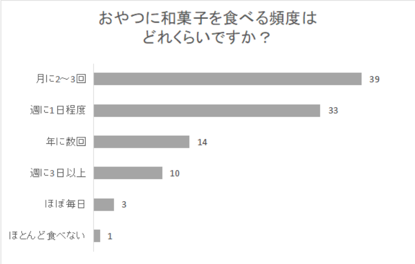 つぎに、「おやつに和菓子を食べる頻度はどれくらいですか?」というアンケートも行いました。一番多かった回答は、「月に2~3回程度」と答えた人が39人でした。