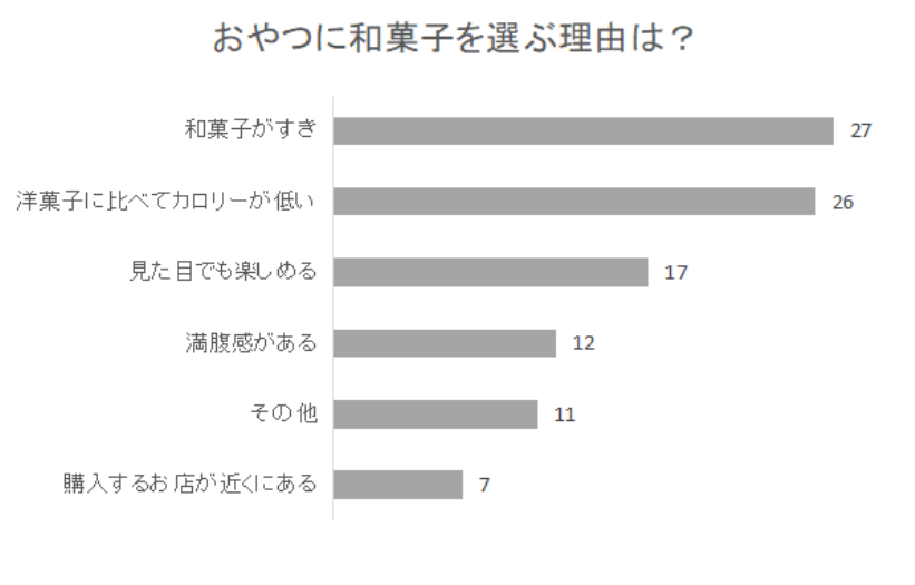 すると、一番多かった回答は「和菓子がすき」で27人という結果です。ほぼ同じ回答数で、「洋菓子に比べてカロリーが低い」も26人です。