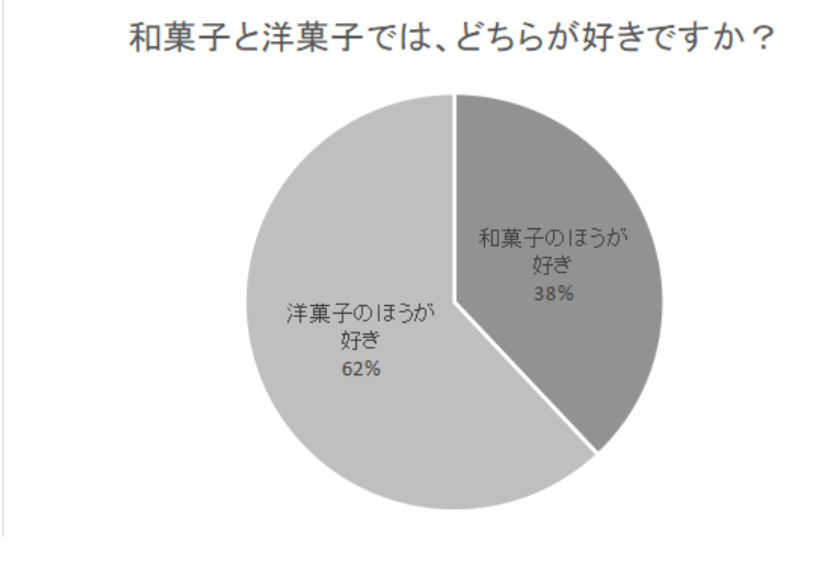 綺和美では、「和菓子と洋菓子では、どちらが好きですか?」というアンケートを行いました。すると、「和菓子のほうが好き」と答えた人が38%、「洋菓子のほうが好き」と答えた人が62%という結果になりました。