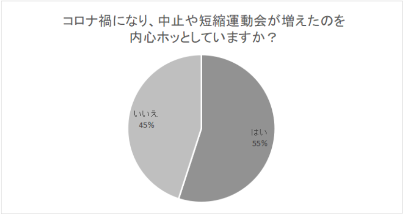 しかし、近年のコロナ禍の影響で今までのような賑やかな運動会は難しくなっています。ほとんどの学校で、中止や短縮運動会、学年別運動会といった対策がとられるようになりました。昔ながらの賑やかな運動会も楽しいですが、朝早くからお弁当を作ったり場所取りで校門前に並んだりと少し憂鬱なこともあります。そこで、「コロナ禍になり、中止や短縮運動会が増えたのを内心ホッとしていますか?」というアンケートも行ってみました。