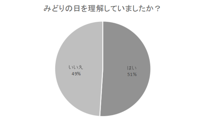 みどりの日は理解していても、ゴールデンウィーク中ということもあり他のイベントとも重なっているのでしょうか。わざわざ、自然に触れあう計画を立てる人は少ないということがわかりました。