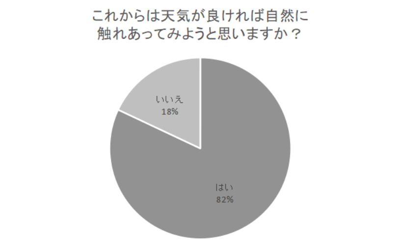 しかし、今回のアンケートに答えてくださった人は、アンケートをきっかけにみどりの日に対する意識が少し変わった人も多くいました。それは、「これからは天気が良ければ自然に触れあってみようと思いますか?」というアンケートを行ってみたところ、82%もの人が「はい」と答えてくれたからです。